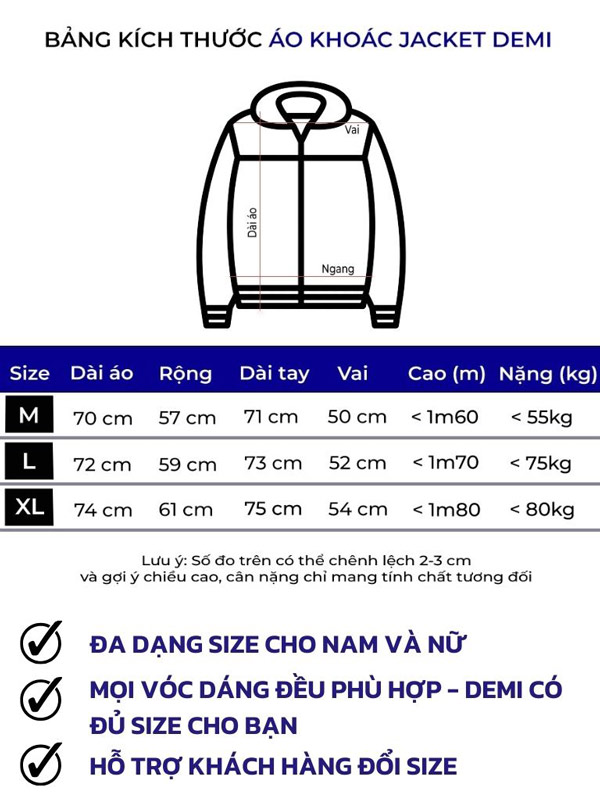 Thông tin bảng size ( kích cỡ ) của áo khoác local brand giá rẻ DEMI :