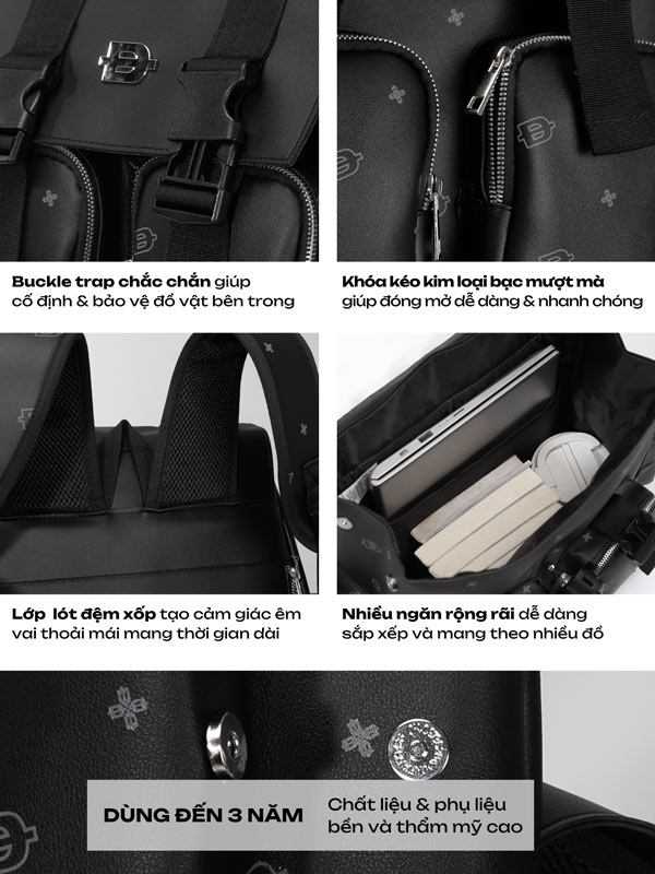 Thiết kế balo đơn giản nhưng được đội ngũ sáng tạo sử dụng phụ liệu độc đáo nút bấm kim loại để đóng – mở miệng balo được làm bằng chất liệu da chắc chắn giúp cho form balo gọn gàng, tiện lợi.
