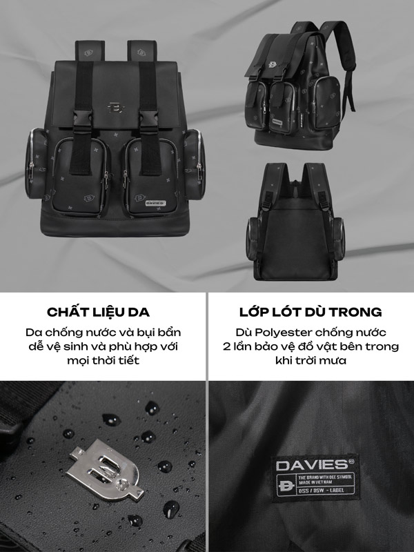 Balo local brand không chỉ sở hữu phong cách thiết kế hiện đại và tính ứng dụng cao mà còn được Davies chú trọng vào chất liệu.Chất liệu da với độ dày tạo form dáng cặp đẹp mắt và có khả năng kháng nước tiện lợi.