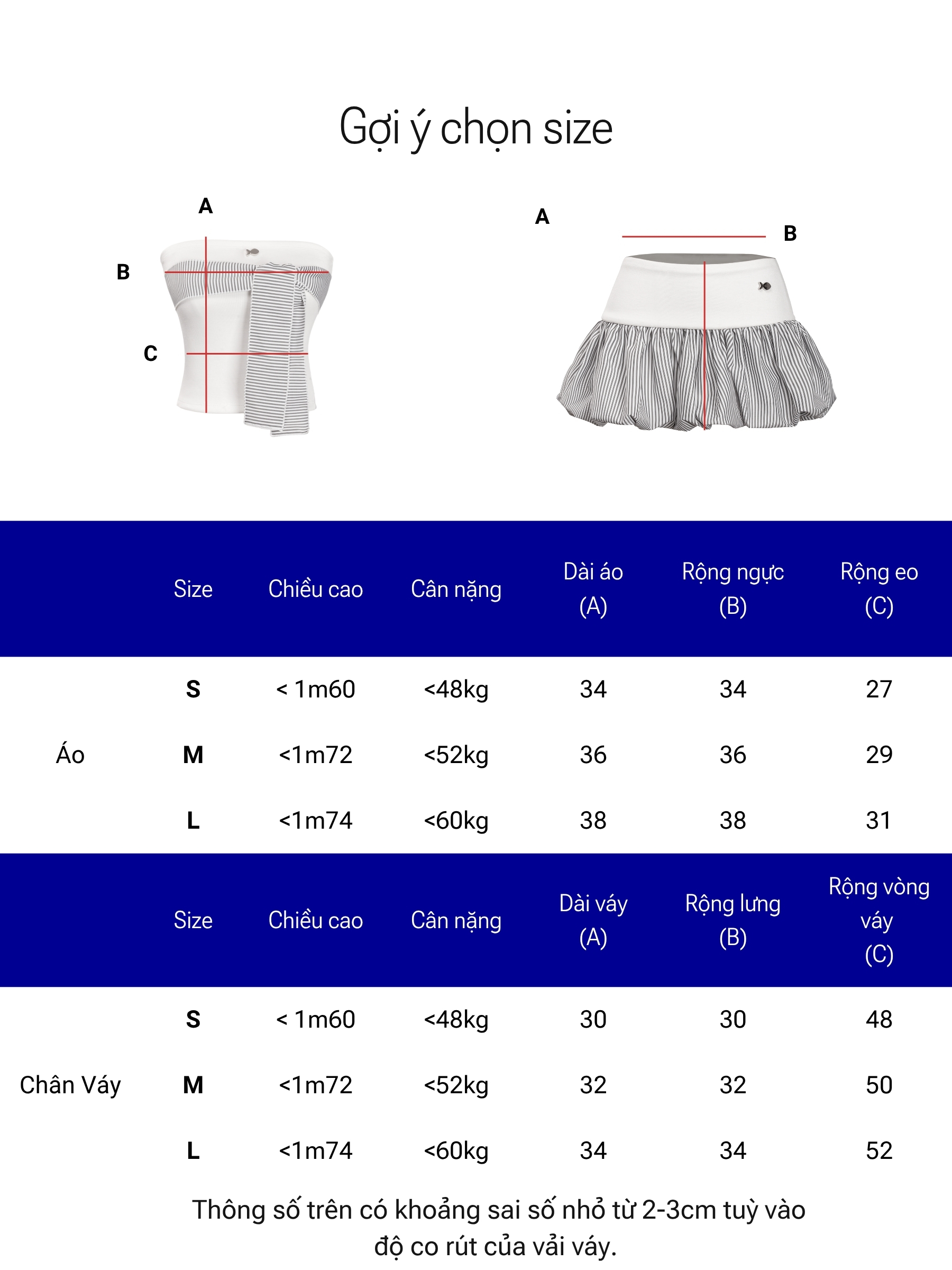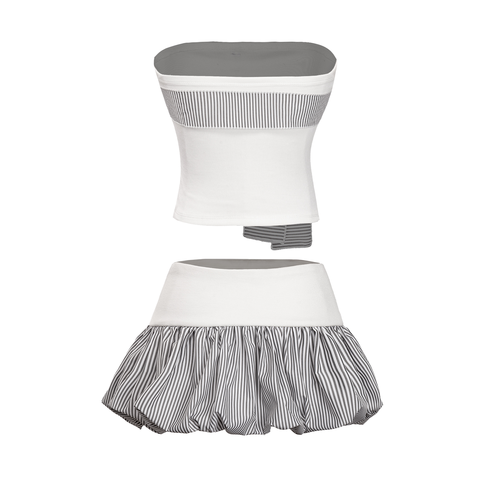 Bộ set gồm áo ống dáng ôm kết hợp cùng chân váy bí phồng ngắn, tạo cảm giác cân đối và đáng yêu trong từng chuyển động. Cả hai thiết kế đều được phối họa tiết sọc nhí nhỏ xinh, làm nổi bật nét dịu dàng, nữ tính mà không hề cầu kỳ.